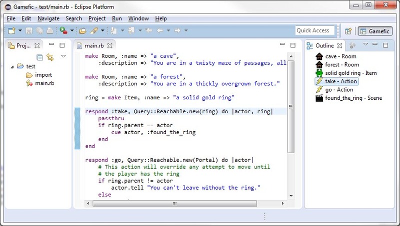 The Eclipse plugin for Gamefic is finally a functional proof of concept. Basic features like creating projects and editing files work. Syntax highlighting is partially implemented. Embedded JRuby libraries allow for realtime code analysis and debugging on the fly.
